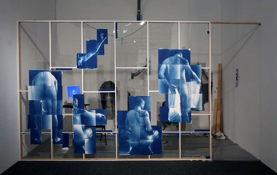 The bathers, large-format cyanotype prints, are presented on the specially constructed transparent exterior wall of Neff’s exhibition booth. A jpeg of the blast-scarred hull of the U.S.S. Cole floats on a computer screen inside the dim booth, a space furnished to resemble a makeshift workshop. Cyanotype renderings of news clippings about the Cole bombing provide further nautical imagery.
