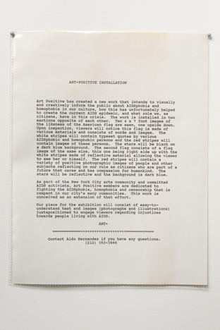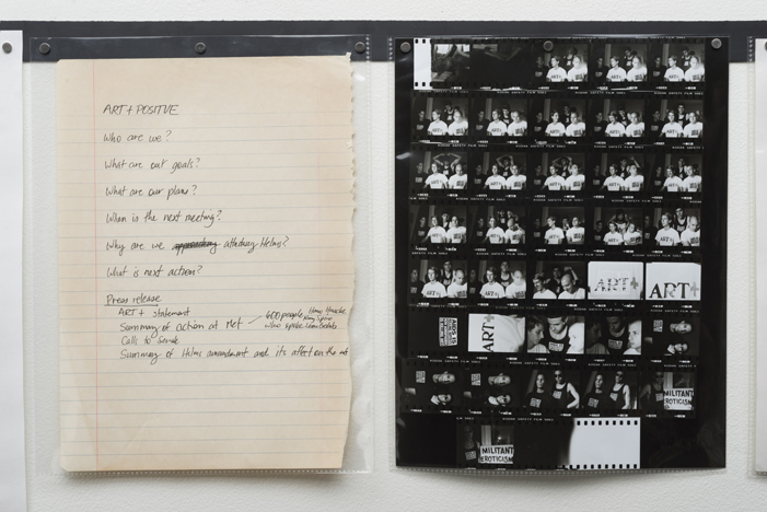 Art+ Positive members included Dennis Davidson, Bill Dobbs, Lola Flash, Catherine Gund, Aldo Hernandez, Leon (Tracy) Mostovoy, Robin Murphy, Ray Navarro, Hunter Reynolds, Jody Rhone, Julie Tolentino and David Wojnarowicz. Collaborating artists also represented in the archive include Donna Binder, David Bradshaw, Ana De Orbegoso, Martha Fleming & Lyne Lapointe, Diviana Ingravallo, Zoe Leonard, Anthony Viti and Michael Wakefield.