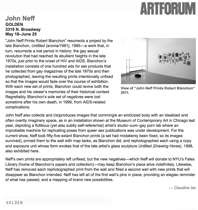 John Neff Prints Robert Blanchon will revolve around Blanchon's 1995 photo-based conceptual work Untitled (aroma / 1981), itself a collection of advertisements for queer sex products selected by Blanchon from pre-AIDS gay publications.