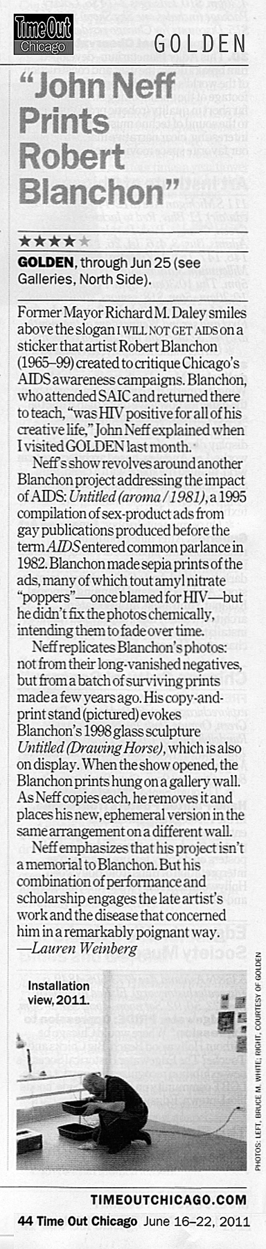 Additional components of the exhibition include Blanchon's 1998 Untitled (drawing horse), a copy-and-print stand by Neff based on that sculpture and a modified, limited edition, bookwork altering the Robert Blanchon catalog published by Visual AIDS in 2006. This artwork continues to develop as Neff maintains a correspondence practice, continuing to mail additions to the each subscriber holding an edition.